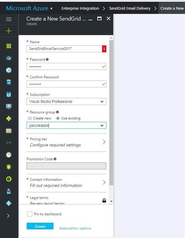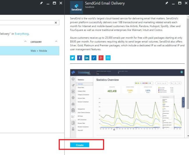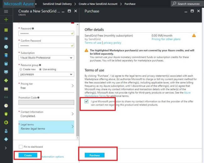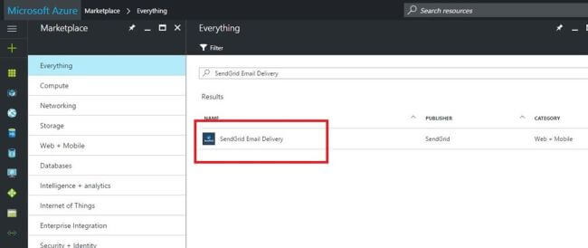 Log into your Azure Account and add a new SendGrid Email Delivery Resource.
