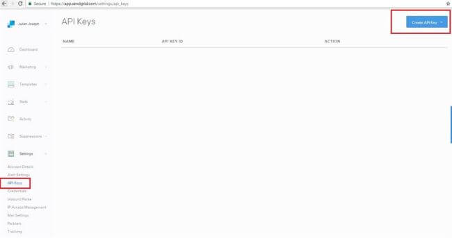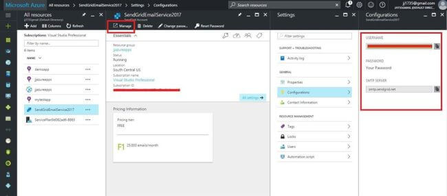 - We can send emails using username and password but the best way is to create an API key. So, click on "Manage" to go to SendGrid website and create an API key which we will use while sending an email.