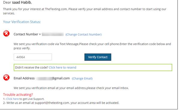 Just fill out this form with the required information and then submit the form. You will receive a verification SMS on the contact number that you have provided here while signing up and you will also receive a verification email on the email address that you have specified. In order to get your account activated with thetexting.com, you need to verify both, your number and your email address. You can see in the figure below how it should look.