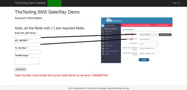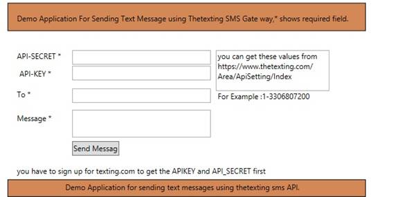 I have already defined the TheTexting API and its key parameters in the previous section. In addition to that I have also attached a demo for web application. Keep in mind that before you can use their gateway to send SMS, you need to sign up for an account with thetexting.com.