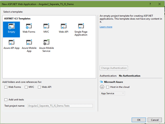 Create a new empty web application and copy the Angular seed project files in the solution directory.