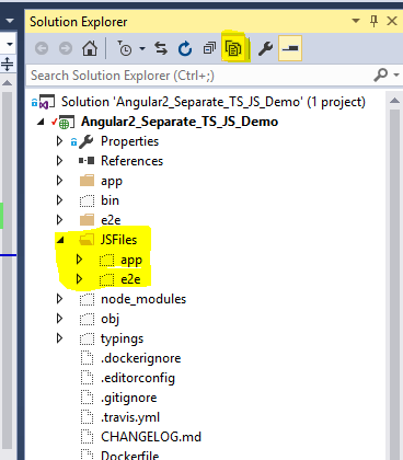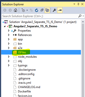 In order to output the JavaScript files to “JSFiles” directory, add the following line under in “tsconfig.json” file.