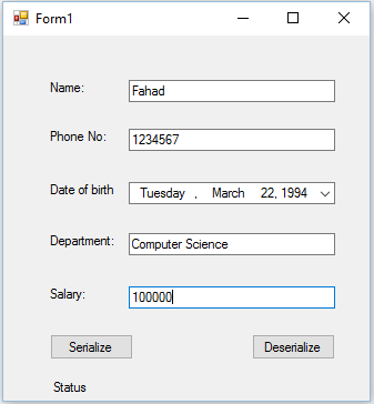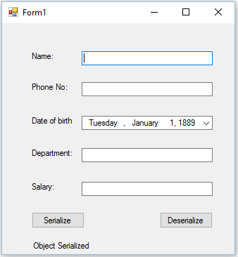 Now to deserialize the object, remove the text from the text boxes and change the date to something else.