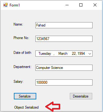 Use BinaryFormatter to serialize the object in BinaryFormat. Make a file using FileStream named "employee.binary". In this file your serialized object will be stored. bf.Serialize(fsout, emp) will serialize the object "emp" and store it in file "employee.binary".