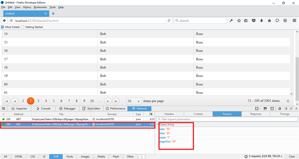 To enable the server paging mention the serverPaging property true in the script. Based on the pageSize the server paging will occur in the kendo grid.