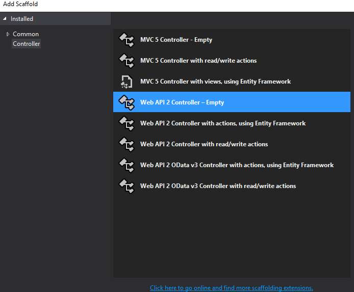 In Solution Explorer, right-click the Controller folder. Select Add -> Controller ->Web API 2 Controller-Empty name it as EmployeesController.cs,