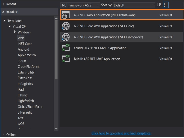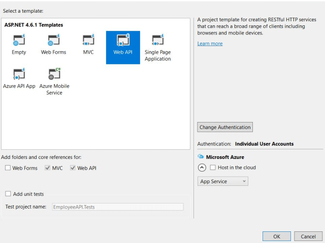 Create a Web API application, using an installed Web template in Visual Studio, as shown below. In my case, I named the application "EmployeeAPI"