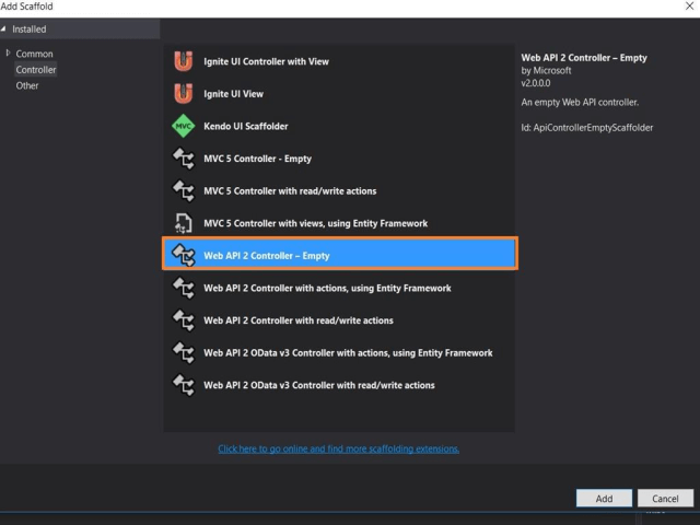 Right click on the Controller folder and add a new Web API 2- Empty controller, as shown in figure 3. In my case, I named it as EmployeeController.cs.