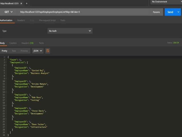 - API End Point /api/Employee/EmployeeListt?Skip=0&Take=5.