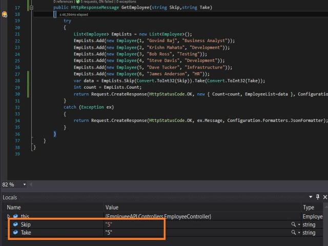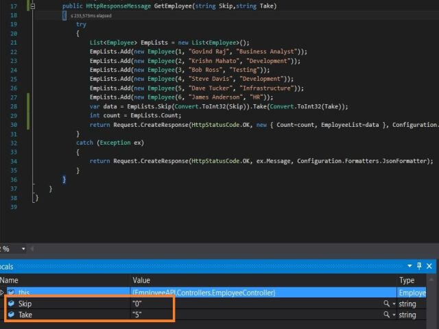 - public HttpResponseMessage GetEmployee(string Skip,string Take)
