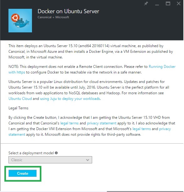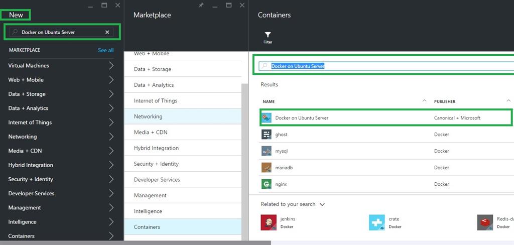 Step 2: In the Jump bar, click New, and search the Azure market place for Docker on Ubuntu Server.