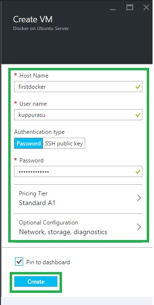 In the Create VM account blade, specify the desired configuration for the Create VM account (Type name for the Host Name, User Name, Password Pricing Tier & Resource Group). Click Create button at the bottom of the screen to create.