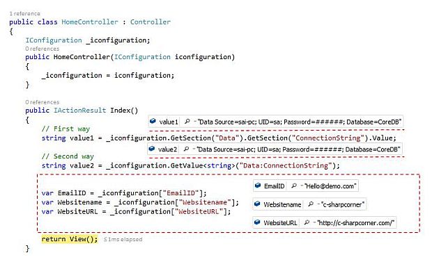 Reading values from "appsettings.json" file We are going to use Constructor injection with the homeController for reading the values. For that, I have added a Constructor named HomeController (same as class name) which takes IConfiguration Interface as an input parameter.