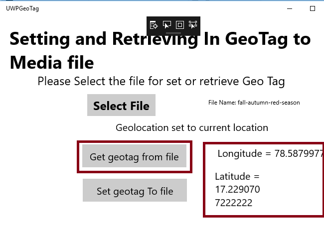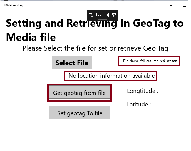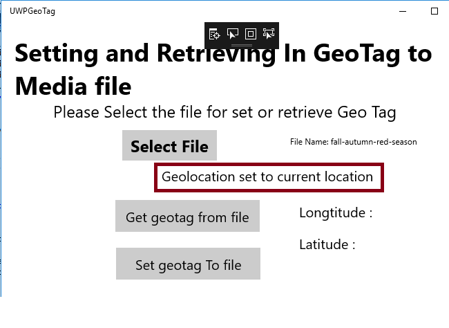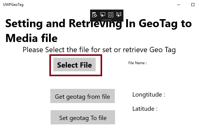 - <TextBlock x:Name="tblsel" HorizontalAlignment="Left" Margin="75,112,0,0" Text="Please Select the file for set or retrieve Geo Tag" TextWrapping="Wrap" VerticalAlignment="Top" FontSize="24" FontWeight="Normal" />