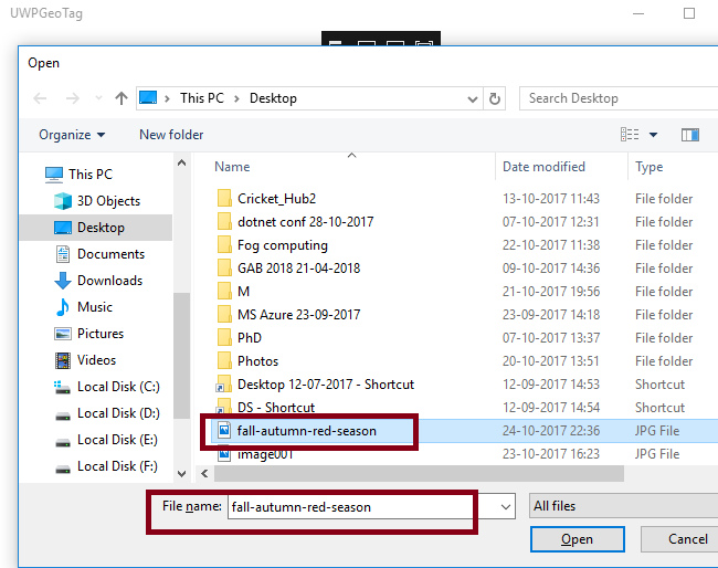Deploy your app on the Local Machine. The output of the UWPGeoTag app is shown below.