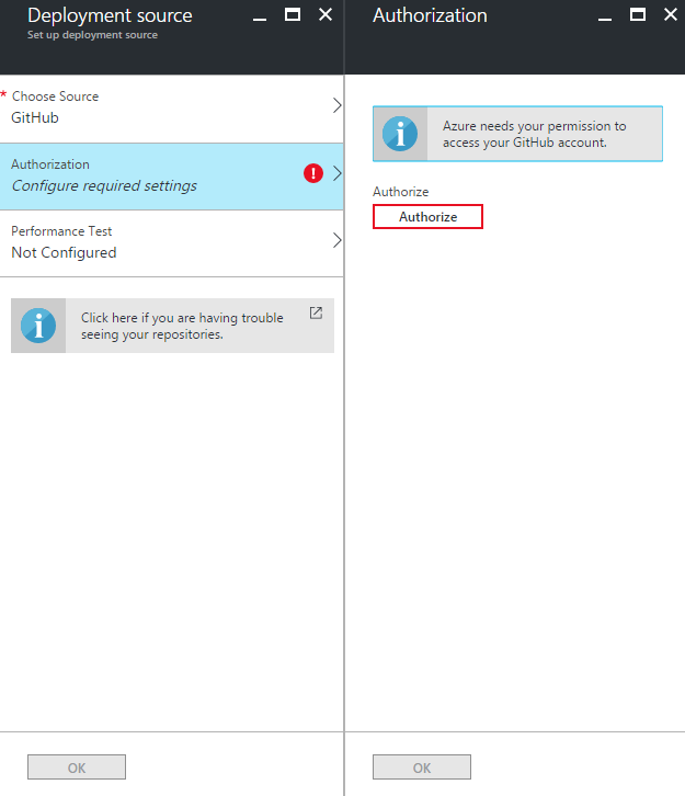 So in GitHub Deployment Options click on Authorize and in the Authorization Window click Authorize.