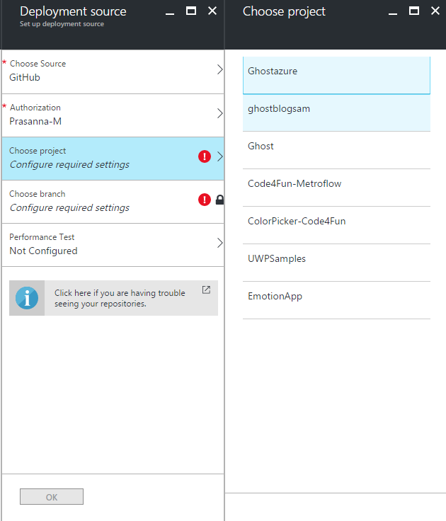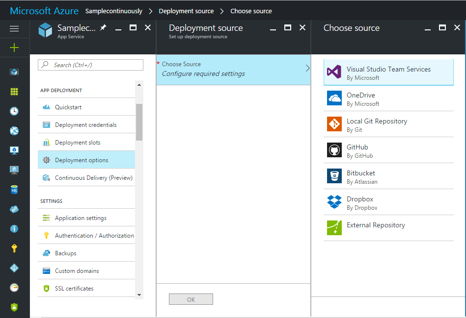 In the settings blade, scroll down and find deployment source under app development. Click it and click to choose a source. Click GitHub Repository. Once deployment source is selected, click OK.