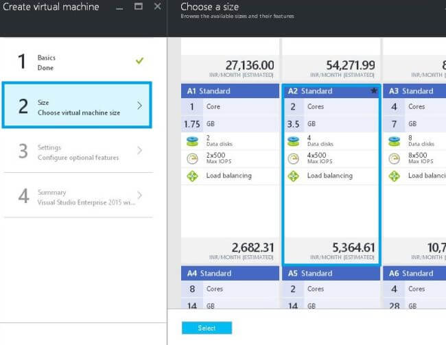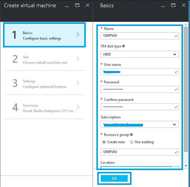 Step 4- In the Virtual Machine account blade, specify the desired configuration for the VM account (Name, User Name, Password & Resource Group). Click Create button at the bottom of the screen to create the Virtual Machine.