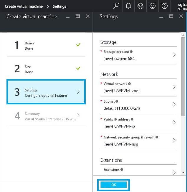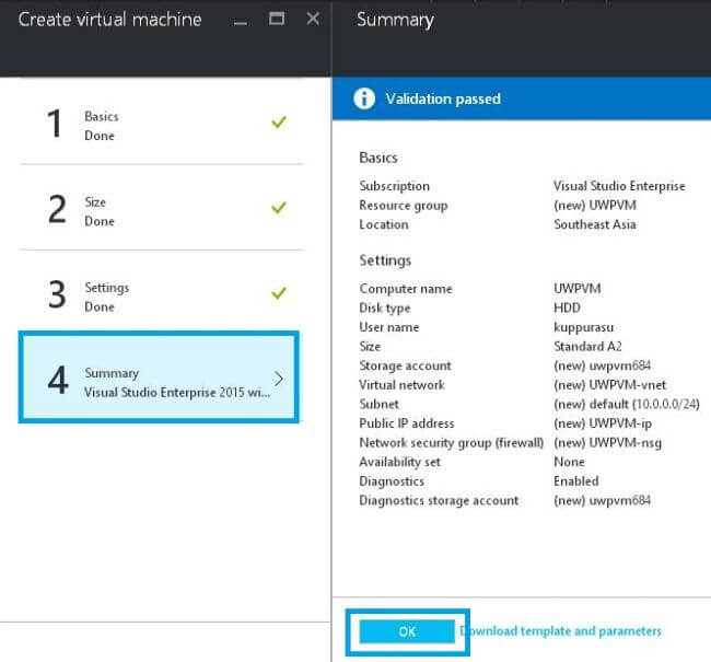 Step 6- In the Virtual Machine Setting blade, if needed specify the desired configuration, else click OK button.
