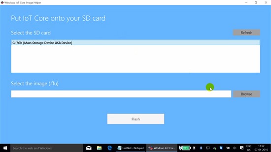 Insert your SD card on your card reader and plug in to your laptop or PC with the USB port, now run the program called WindowsIoTImageHelper
