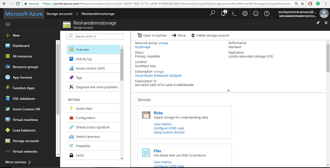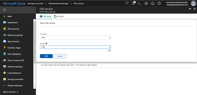 To create a file share, you can use either an existing storage account or create a new storage account, provided it is a standard type (not premium). From the storage, create a new File Share.