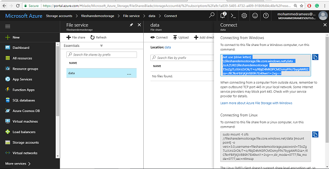 On clicking the "Connect" button, you can get the syntax to map the drive for both, Windows and Linux platforms.