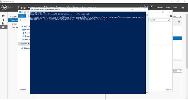 Copy the syntax and add the desired drive letter followed by colon(:). You can check the syntax that contains the name of the storage account; followed by the name of the share with a username which is same as the name of the storage account; followed by a password which is basically a security key you can also access from the "Access key" section of the storage account. When you run the command in PowerShell with the drive letter added, you can see a Shared drive mapper to Azure storage.