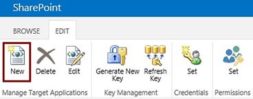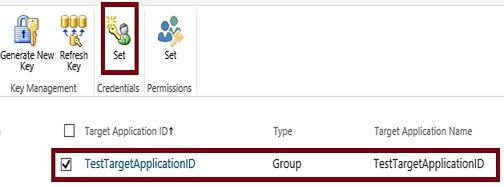 - The newly created Secure Store Application ID will be displayed on the page select the Secure Store Service Application ID and click Set in the Credentials Section.