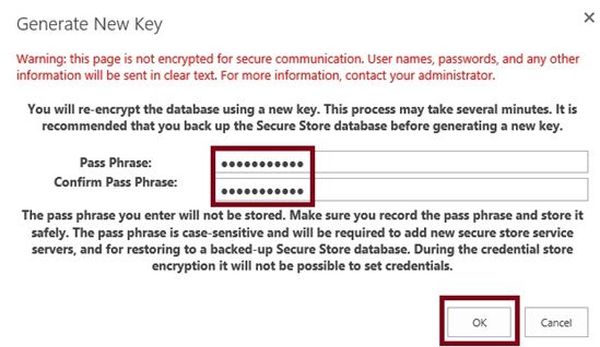 - On the Generate New Key page, type the Pass Phrase, and type the same string in the Confirm Pass Phrase and click OK. This pass phrase is used to encrypt the Secure Store database.