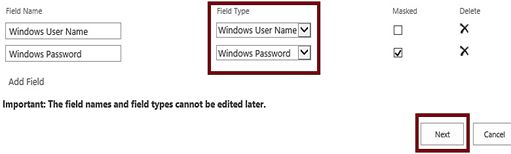- Select Field Type: Windows User Name for Field Name: Windows User Name & Field Type: Windows Password for Field Name: Windows Password and click Next.