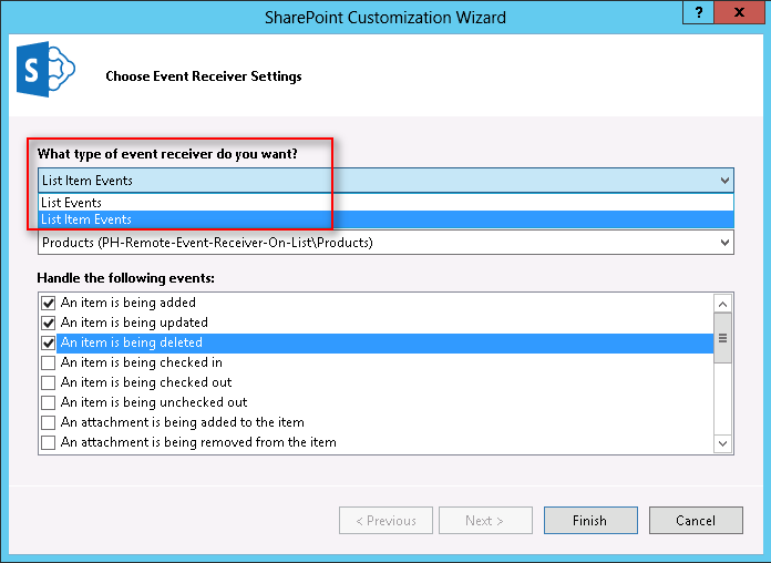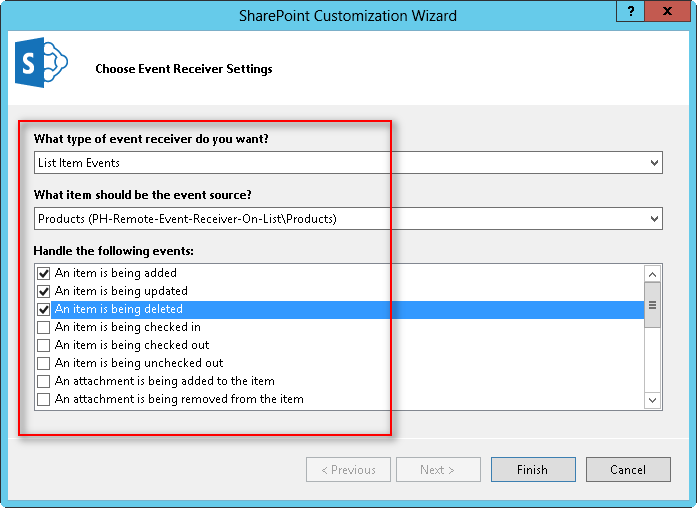 - Choose what events you want to be handled by this Remote Event Receiver. For now I am choosing “Item Added”, “Item Updated” and “Item Deleted” events.