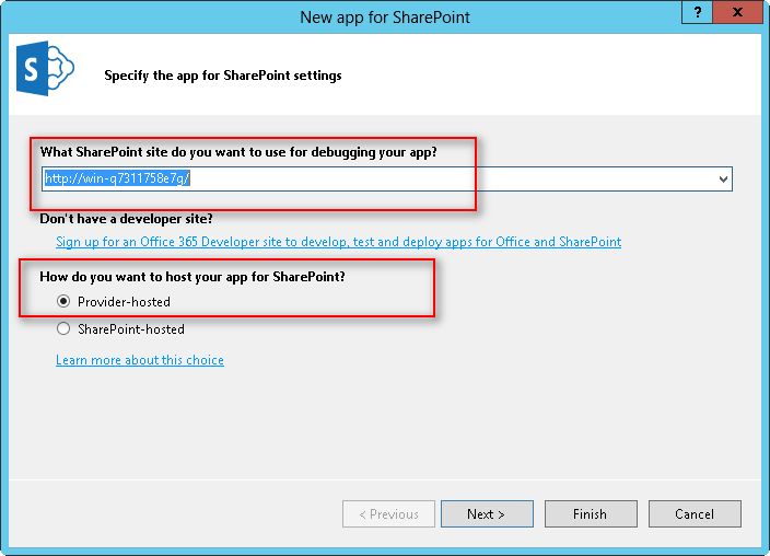 - Specify the URL of Host Web and select “Provider-Hosted” as Hosting Model.