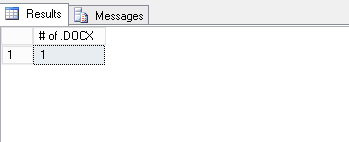 - COUNT(*) AS ‘ # OF .DOCX’ FROM DOCS INNER JOIN WEBS ON DOCS.WEBID = WEBS.ID INNER JOIN SITES ON WEBS.SITEID = SITES.ID WHERE DOCS.TYPE <> 1 AND (LEAFNAME LIKE ‘%.DOCX’) AND (LEAFNAME NOT LIKE ‘%TEMPLATE%’)
