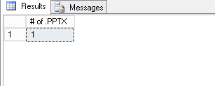- COUNT(*) AS ‘ # OF .PPTX’ FROM DOCS INNER JOIN WEBS ON DOCS.WEBID = WEBS.ID INNER JOIN SITES ON WEBS.SITEID = SITES.ID WHERE DOCS.TYPE <> 1 AND (LEAFNAME LIKE ‘%.PPTX’) AND (LEAFNAME NOT LIKE ‘%TEMPLATE%’)