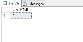 - SELECT COUNT(*) AS ‘# OF .HTML’ FROM DOCS INNER JOIN WEBS ON DOCS.WEBID = WEBS.ID INNER JOIN SITES ON WEBS.SITEID = SITES.ID WHERE DOCS.TYPE <> 1 AND (LEAFNAME LIKE ‘%.HTML’) AND (LEAFNAME NOT LIKE ‘%TEMPLATE%’)