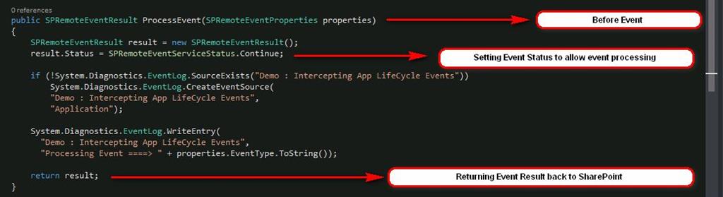 - ProcessEvent: This is “Before or Synchronous” Handler, which executes before any action (like List Item Added/Updated/Deleted) takes place. This is a Two-Way Event Receivers which means it takes instructions from SharePoint based on User Actions (List Items Added/Deleted), Process it and returns back the result to SharePoint. This function has a return type of type “SPRemoteEventResult”.