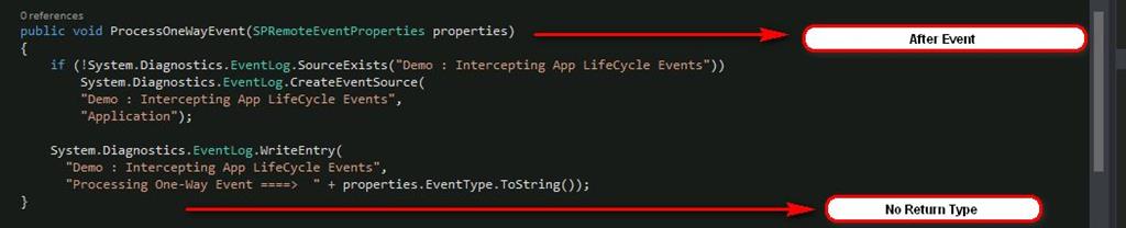 - ProcessOneWayEvent: This is “After or Asynchronous” Handler, which executes after any action (like List Item Added/Updated/Deleted) completed. This is not a Two-Way Handler so it will just accept the instructions from SharePoint based on User Actions (List Items Added/Deleted) and does not returns back any result or notification to SharePoint. This function should be mainly employed for operations like Logging, Sending Notifications to App Users and so on.