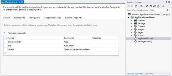 Open the Manifest Designer view (double-click the AppManifest.xml file). On the General tab, the Title text box should show the app name that you typed in "New app" text box. Choose the Permissions tab to add the following permission requests for the app (see Figure ).