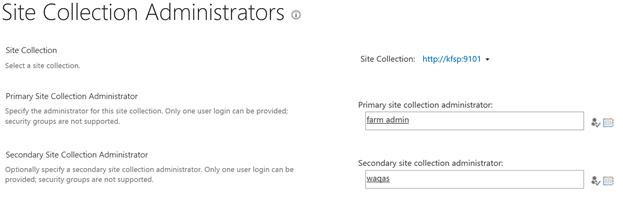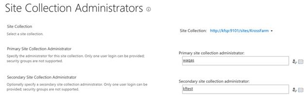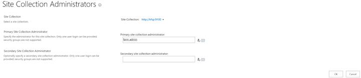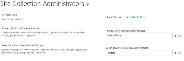 On this page, we can view, add, remove, and change the primary and secondary site collection administrators for a site collection.