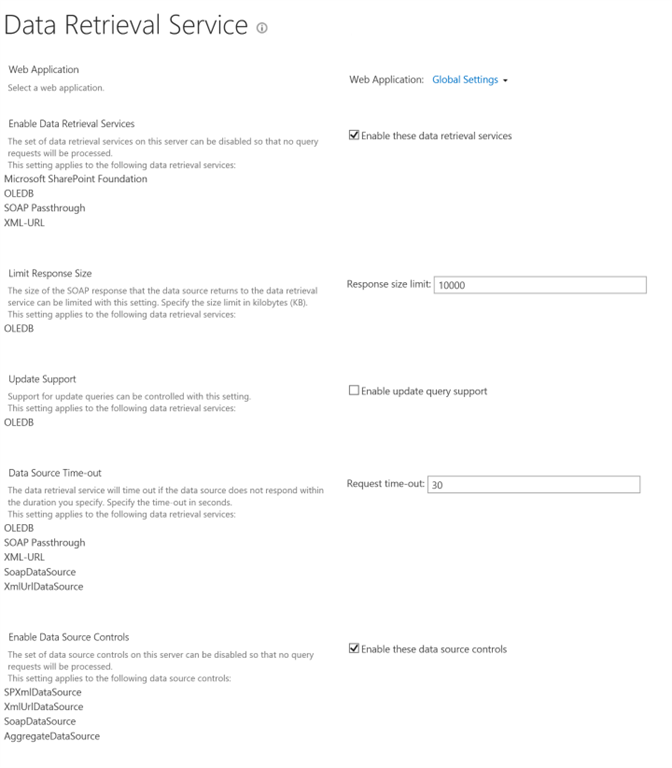 When you click on the "Configure the data retrieval service" link, you will land on the "Data Retrieval Service" page. This page lets you configure the data retrieval options for global or for individual web applications. These settings are web application scoped; i.e., all the the site collections under the same web application inherit the same settings.