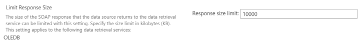 Specifies the response size of the data source that is returned to the data retrieval service. Its default value is 10000 (10 KB). If you want to increase the value, then I would highly recommend you monitor the performance of your SharePoint. In some cases, the memory utilization gets spiked. ![]()
