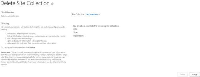 When you click on the "Delete a Site collection" link, you will land on the “Delete Site collection” page. This page will allow you to delete a site collection.