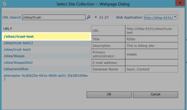 - If site collection is not listed, then search for it. You have to search with a Short name. In the URL search, type the URL i.e /ManagedPath/sitecollection in our case/ sites/ trust-test.