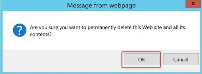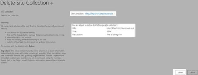 - Now, it will bring back the main screen. Double check the site collection name and click Delete.