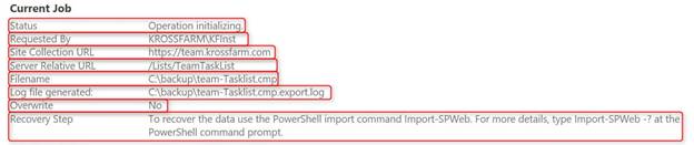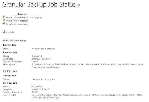 If you want to view the granular backup job status from Central Admin, then this page will display the information about both the Site Collection Backup and the Content Export job. The beauty of this page is that it is auto refreshed after every 30 seconds.