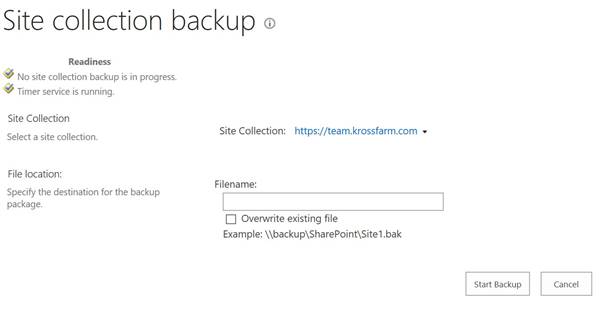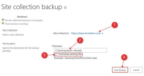 Let’s take the backup of the Team site collection (team.krossfarm.com) by following the instructions below.