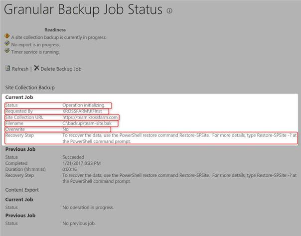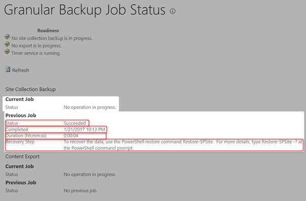 - On this "Granular Backup Job Status" page, you will see the status of the backup job. This page is set to auto refresh after every 30 seconds but you have an option to refresh it manually by pressing F5 button. Under the Site collection backup, you will see the current job status and also the previous job status (if previous job was successful).
