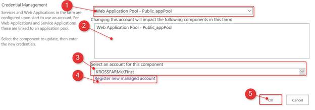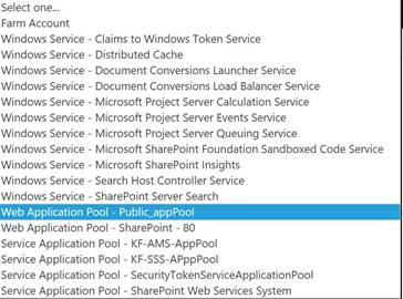 In this example, we will change the Public Web Applications app pool’s account from krossfarm\kfadm to krossfarm\kfinst. Please follow the steps given below to change the Service account.