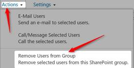 - From the ribbon Click on Action dropdown and click on Remove Users from Group