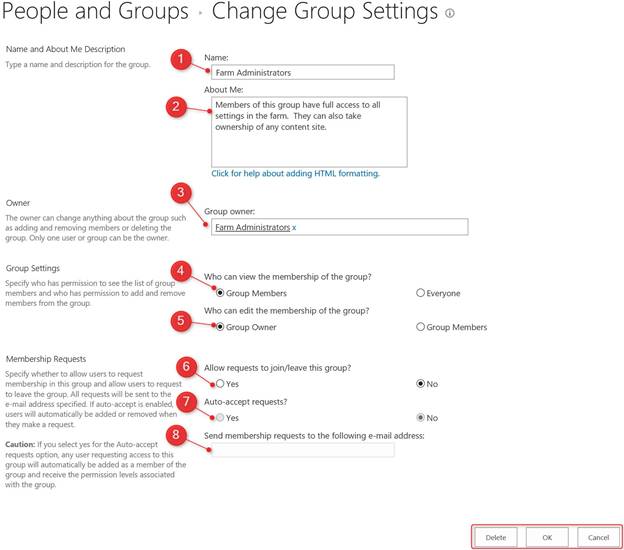 - Group Owner change the group owner ( default value is farm administrator group).
